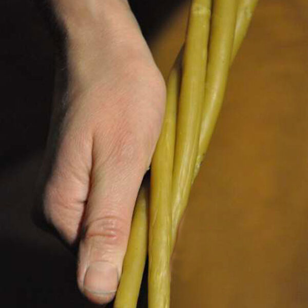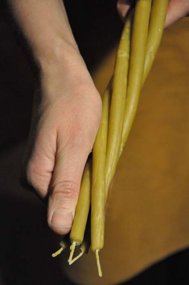 dvigubą arba viengubą (kas be poros) rankų darbo žvakę ir žinias apie žvakių